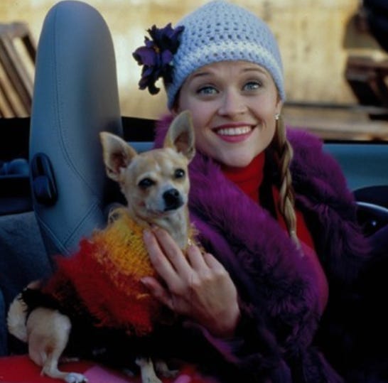 In the beginning of the movie you see the life that Elle Woods has so far, she comes from a very privileged background. First of all, she is the president of her sorority… which means she has a lot of connections. Many friends, many parties to attend — basically really popular at college. Elle has two b.f.f.s who are honestly adorable and a charming little dog that always goes with her. Other people love her, admire her — she has a strong support system.